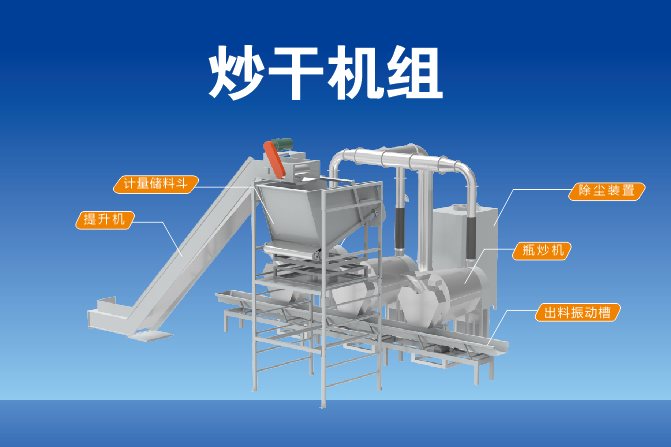 機(jī)組組成:本機(jī)組由瓶式炒干機(jī)、計(jì)量?jī)?chǔ)料斗、提升機(jī)、出料振動(dòng)槽、除塵裝置、機(jī)組集成控制系統(tǒng)組成。